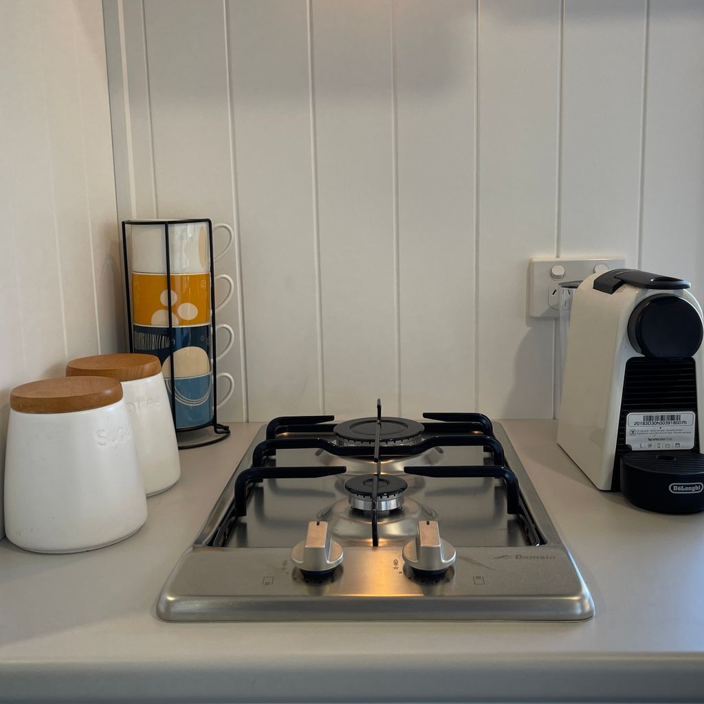 Compact kitchen with cooktop, microwave, toaster and coffee pod machine.