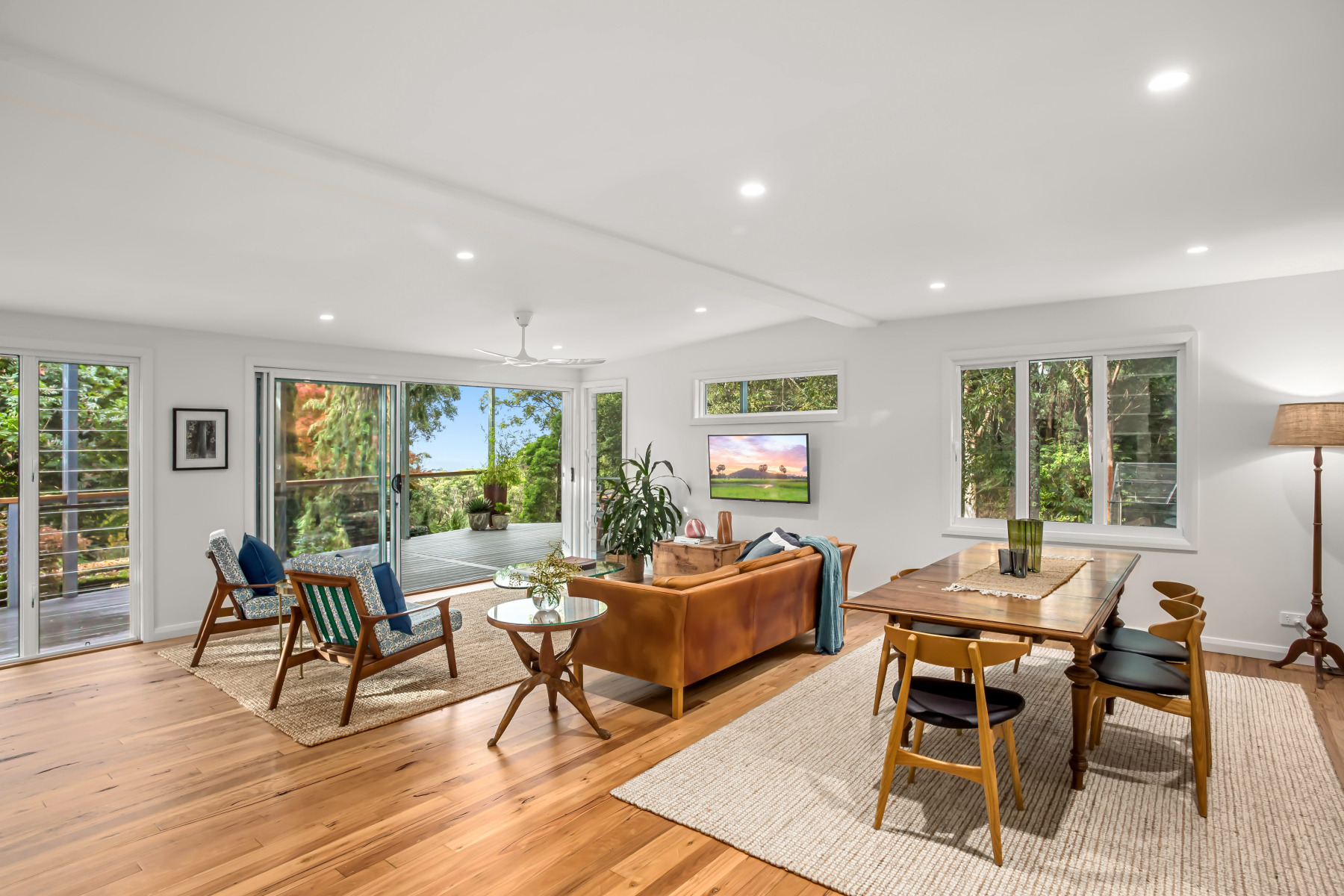 ~Open plan living flowing to covered deck overlooking gardens and lawn areas.