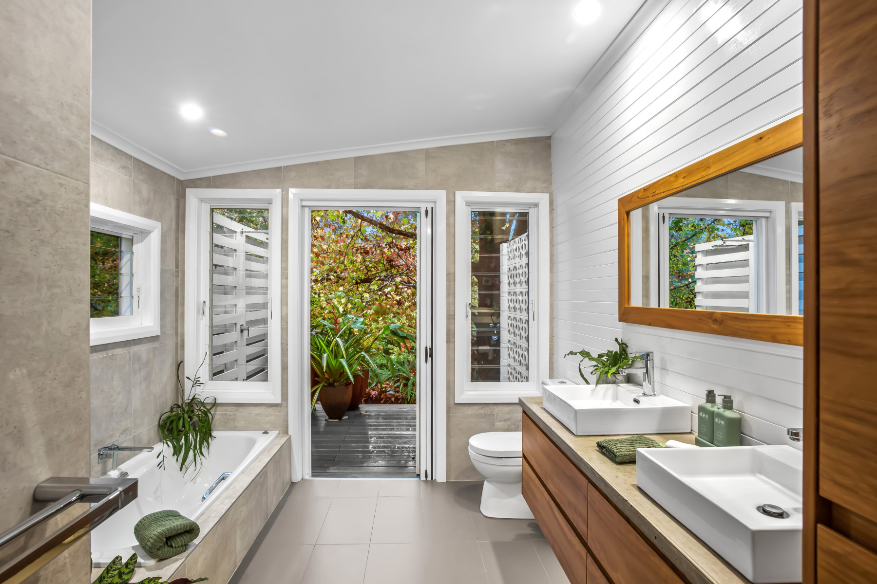 ~ Main bathroom features bespoke blackbutt timber cabinetry, bath, underfloor heating plus indoor and outdoor showers.