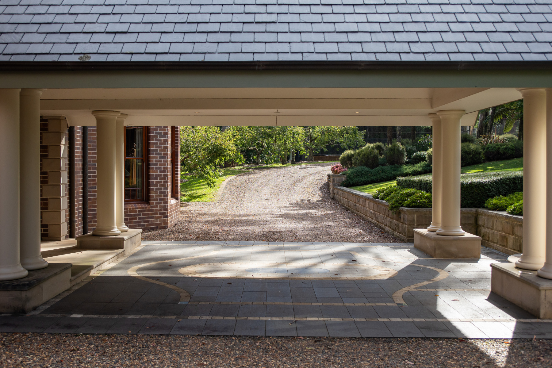 A sweeping gravel driveway punctuated by a grand porte-cochere, creating an elegant all-weather arrival experience