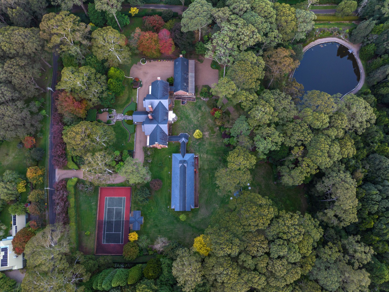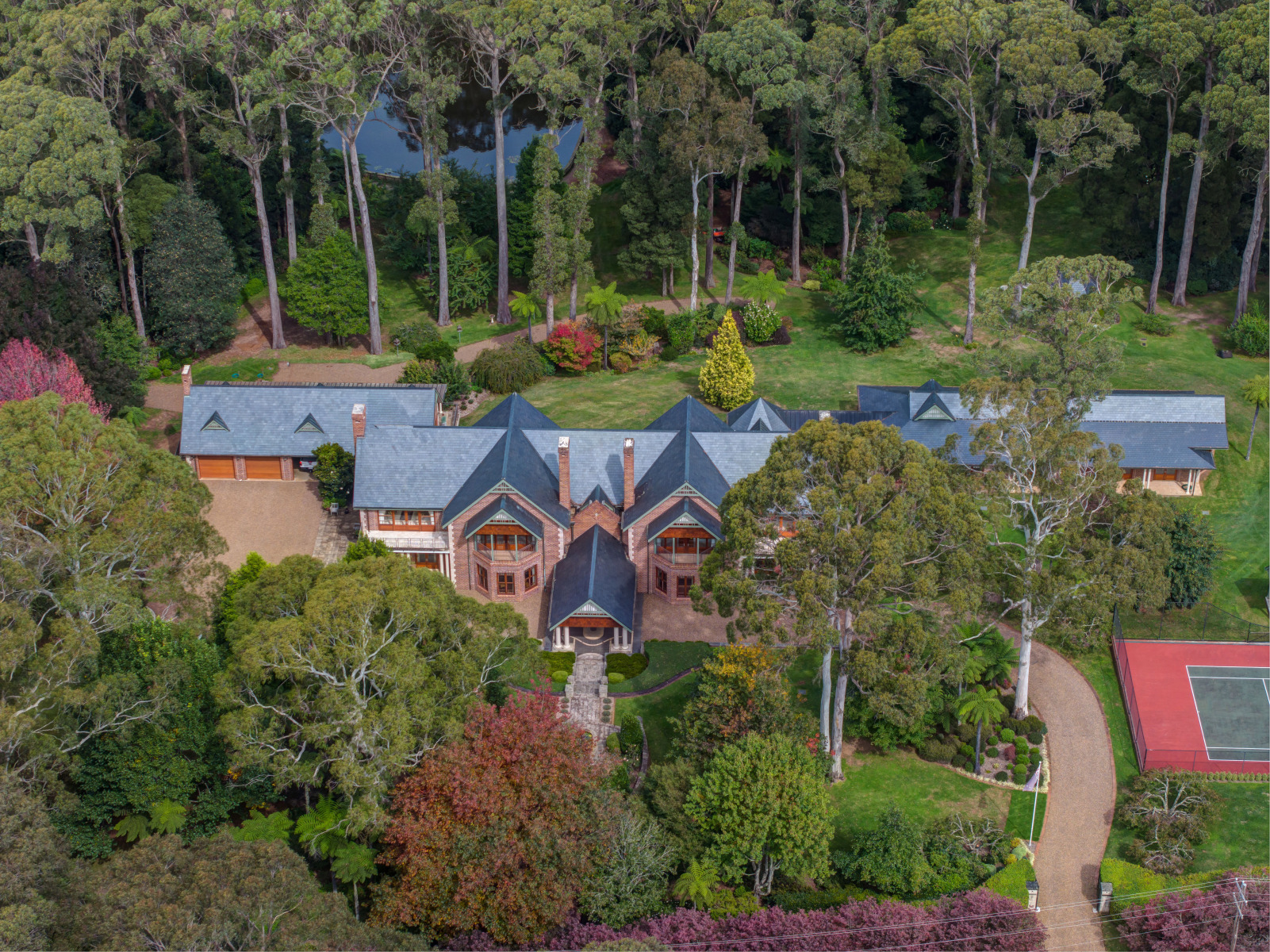 The home is defined by its slate-gabled roofline, soaring ceilings, parquetry floors and tall French doors, while a sweeping driveway creates an impressive arrival.